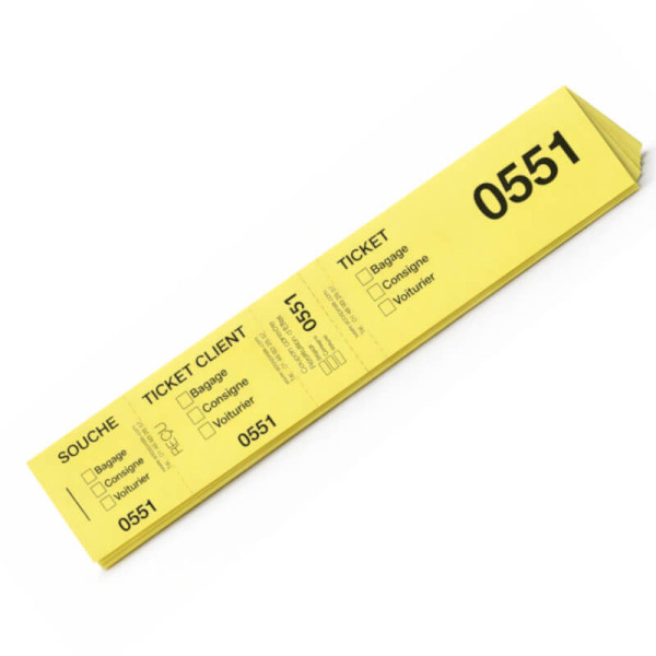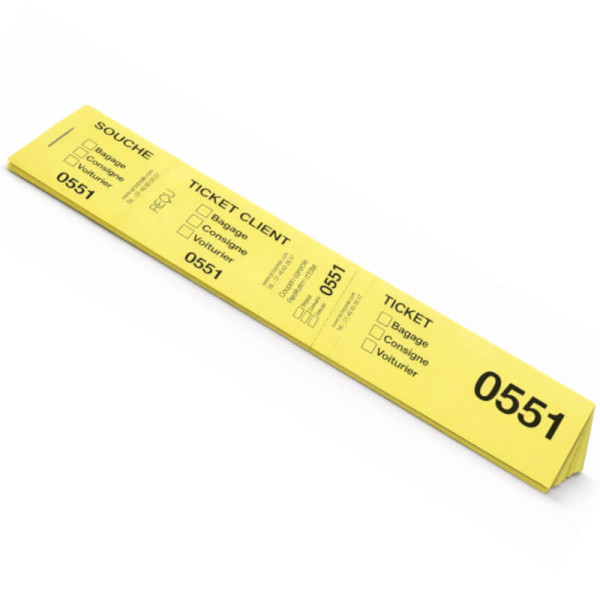 Nous proposons les tickets jaunes 40x297mm bagages/consignes/voiturier en carnet de 50 tickets numérotés.